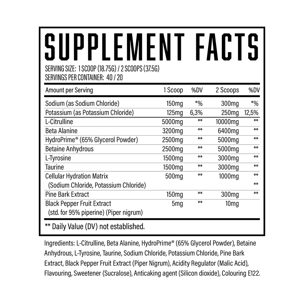 Pump Serum enthält 10 wissenschaftlich fundierte Inhaltsstoffe in massiven Dosierungen. Wir haben 10.000mg reines L-Citrullin, 5.000mg HydroPrime® Glycerol, 5.000mg wasserfreies Betain und viele weitere Inhaltsstoffe hinzugefügt, die synergetisch wirken.